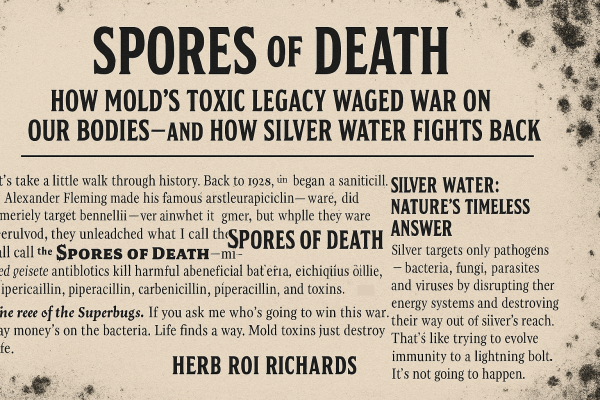 Let’s take a little walk through history, back to 1928, when Alexander Fleming made his famous accidental discovery of penicillin, a mold that stopped bacteria dead in their tracks. Medical science threw a parade and called it a miracle. But while they were patting themselves on the back, they overlooked the fine print: Penicillin wasn’t… Continue reading Spores of Death: How Mold’s Toxic Legacy Waged War on Our Bodies and How Silver Water Fights Back